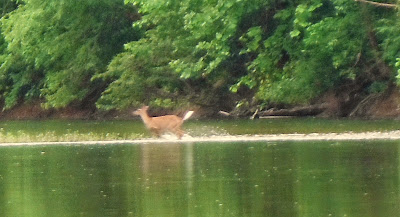 From some distance away I spotted a deer, apparently down at the water's edge having a drink. I floated quietly, paddling only to steer, so I could get as close as possible without spooking him. He didn't seem to be moving and stayed longer than I expected for a deer having an afternoon drink. As I got closer I could see that he was actually standing out in the river eating vegetation that was emerging from a sandbar that was being exposed as the water level dropped. He finally did take off, but I got closer than I had expected.