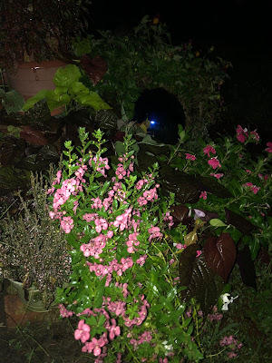 Garden pictures, featuring the release of two monarch butterflies raised by friend and neighbor, Jan. These may be the final garden pics of the season. Some things have petered out, some have been buried under mounds of sweet potato vine that are beginning to resemble kudzu. The nighttime pictures were taken after a rain and feature the only form of insect control that we employ. I just wish he worked on weeds.