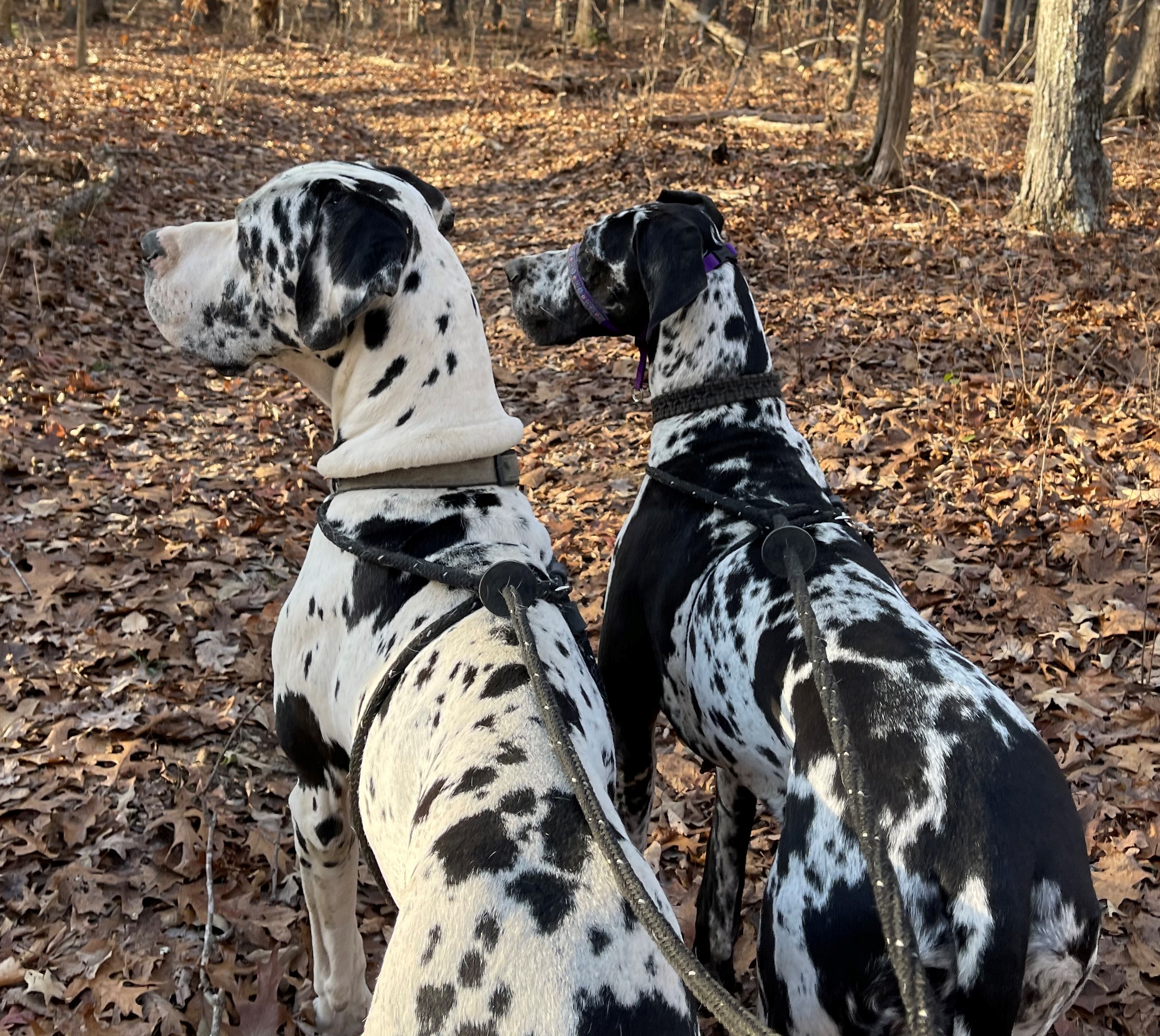 I was getting tired from Della's pulling so I put the short leash on her Gentle Leader and used that for a while. She doesn't really mind that and it keeps her at my side with no effort on my part, and my arms and shoulders appreciated the break. Chase dropped back with her, so I had both dogs walking on my left, which was fine when the trail was wide enough to allow it. I moved Chase over to my right side, making myself the center of a Great Dane sandwich. That was our best arrangement and it looked like I was walking two very well trained dogs. However, by the time we landed on this configuration it was getting dark and the park was emptying out, leaving no one to appreciate it.