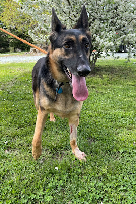 First it was Delgado, a male German Shepherd Dog, who arrived early in the afternoon. He's not really our dog yet. He's with Dogs Deserve Better - Blue Ridge (DDB-BR), a wonderful group that took him in to help out a woman who is currently homeless. They took two dogs, Delgado and his sister, and put them in a boarding kennel. The two dogs were siblings and had lived together all their lives, most recently in a small RV from which the owner was recently evicted. However, the dogs stressed out in the kennel, which is normal and common, especially for shepherds separated from their owner. A fight broke out and poor Delgado got the worst of it by far. He landed at a vet and ended up needing to have one of his toes amputated. He couldn't go back where he had been, obviously, and vet boarding is expensive so he came here. The deal made between the owner and DDB-BR is that they would care for the dogs for 30 days, after which they are surrendered to be adopted if the owner hasn't been able to find a place for herself and the dogs.