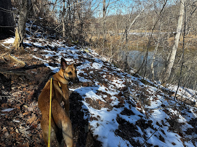 After the morning feed and deworming, I took Bailey out alone for a hike. It was cold but the sun was shining and the temperature was trying to rise. I used a rope harness on her today, a first, but it was a good choice because she could pull as much as she wanted and I wasn't pulling on her head and neck. She's not interested in the stop and sniff style of walking so we moved right along. I took her across the stream and up the bluff along the river, which was new territory for her and she really enjoyed it. Once we crossed the stream I only saw tracks of one person and one biker who had been on the trails over there since the snow. We went over 3.5 miles and on the more hilly parts of the trail system so it was good exercise for both of us.