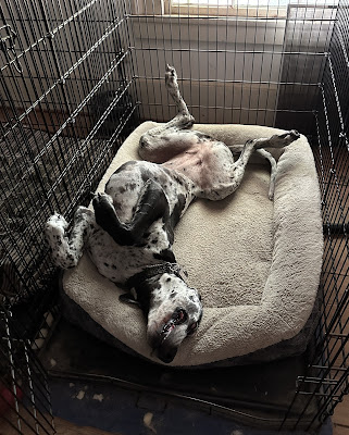 I started the day about 6:00 a.m., fed all the dogs, fed both sets of puppies, cleaned indoor and outdoor puppy spaces, watered all the pots in all the container gardens (that's a lot), made egg muffins, and then got ready for the noon visitors. By the time they were all gone I was pretty well wiped out for the day. I did a second feeding of the puppies and then put the shar pei pups inside the cool puppy shed for the rest of the afternoon. Everyone got their water replaced with fresh, cool, well water, and I went back inside where I failed to nap.