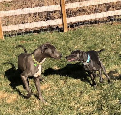Lego is the same breed and size as the female Dane, but is similar to the male Weim in color, forming a nice bridge or continuum between the three dogs. |