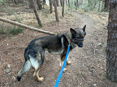 I took Chico and Paisley on a hike late this afternoon. It was cold and windy and I was afraid that Paisley's presence would undo all the progress that Chico had made on our walks. I started out with him on the Gentle Leader as always, but then switched my leash to his collar instead. I left the Gentle Leader on him and I think it served as a reminder of how he was supposed to walk because he was really quite good, sticking to my left side and not pulling me around or moving back and forth the way Paisley was doing.