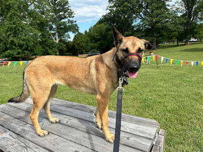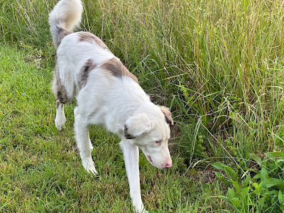 With a halter on Della rather than a harness she doesn't do nearly as much stopping to sniff. Also, Bailey is more interested in movement than scents.
