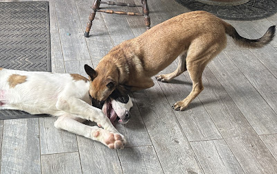 Most of our dogs are accustomed to new dogs coming in, old ones returning, etc. Bailey is still pretty new at this fostering business but she is rapidly figuring it out. Hux immediately became her best playmate ever. He's basically a full sized, animated, stuffy toy as far as she's concerned. He's as sweet as he is clueless so they get along very well.